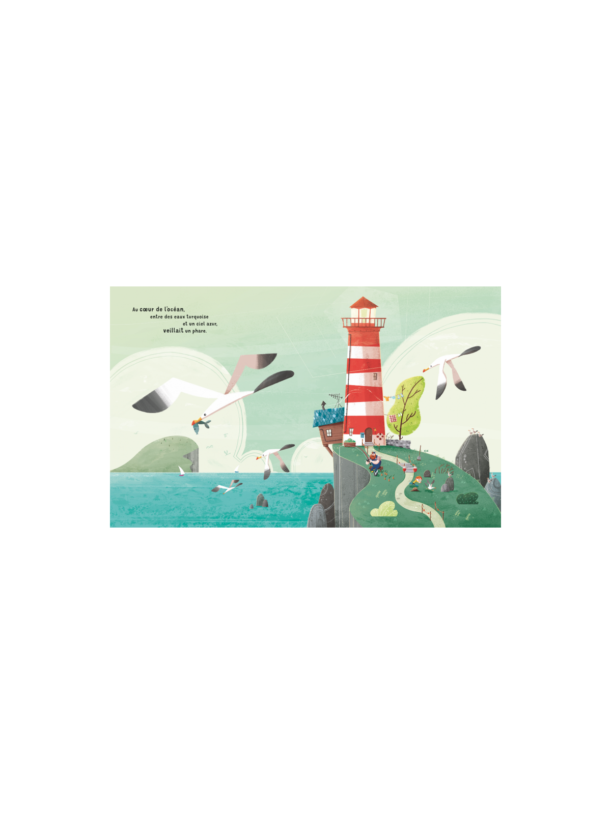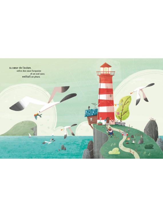 Au cœur d’un lointain océan, entre le bleu de la mer et l’azur du ciel, un phare veillait sur les eaux profondes. Au cœur de ce phare vivaient un papa et sa petite fille, liés par un amour unique et rare que seuls les cœurs bienveillants des gardiens connaissent.