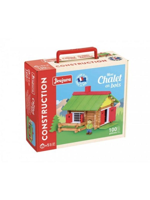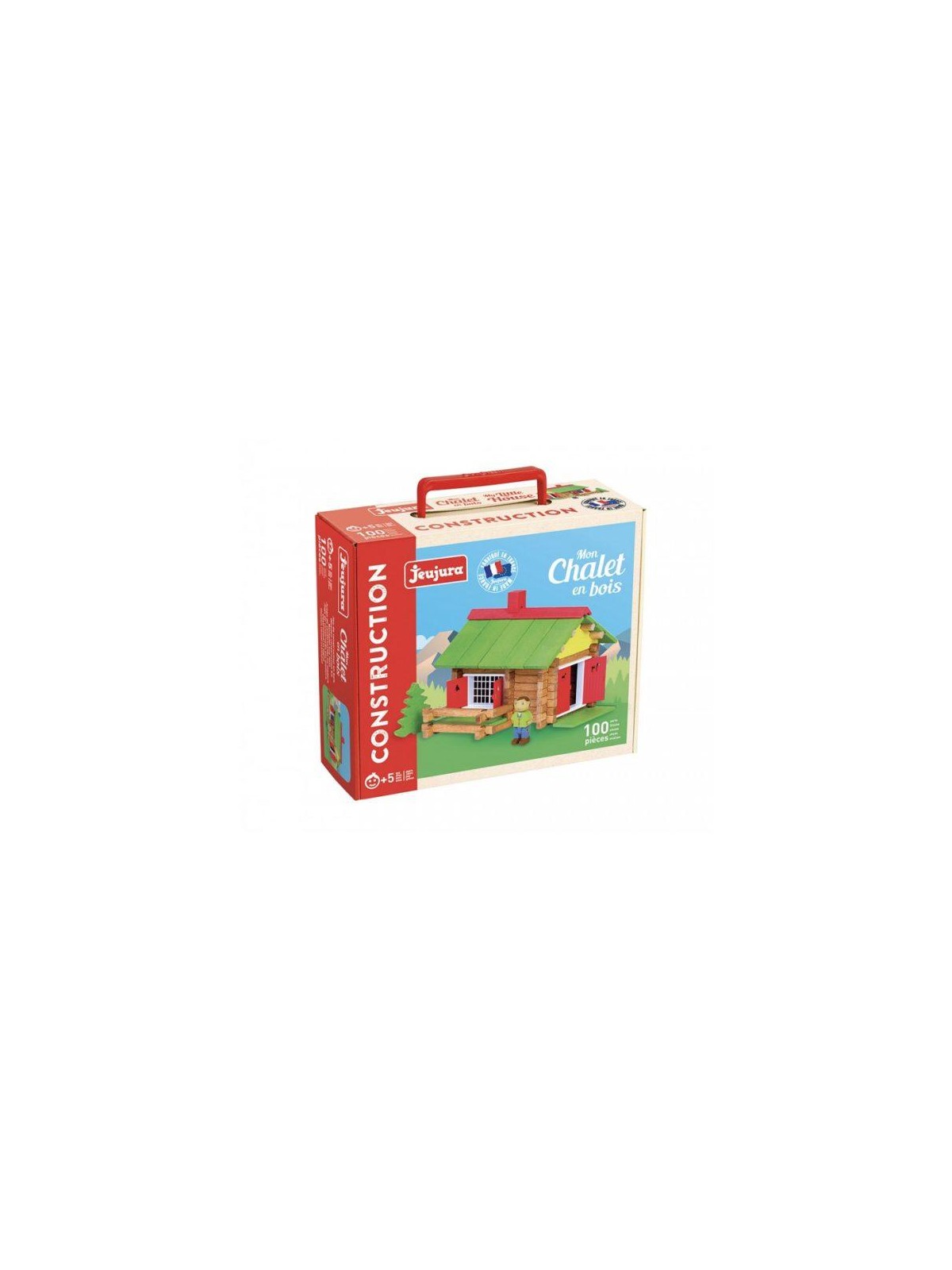 Mon Chalet en Bois : jeu de construction de 100 pièces en bois naturel et teinté avec un tapis de jeu et une notice de montage, dans une valisette de rangement très pratique.