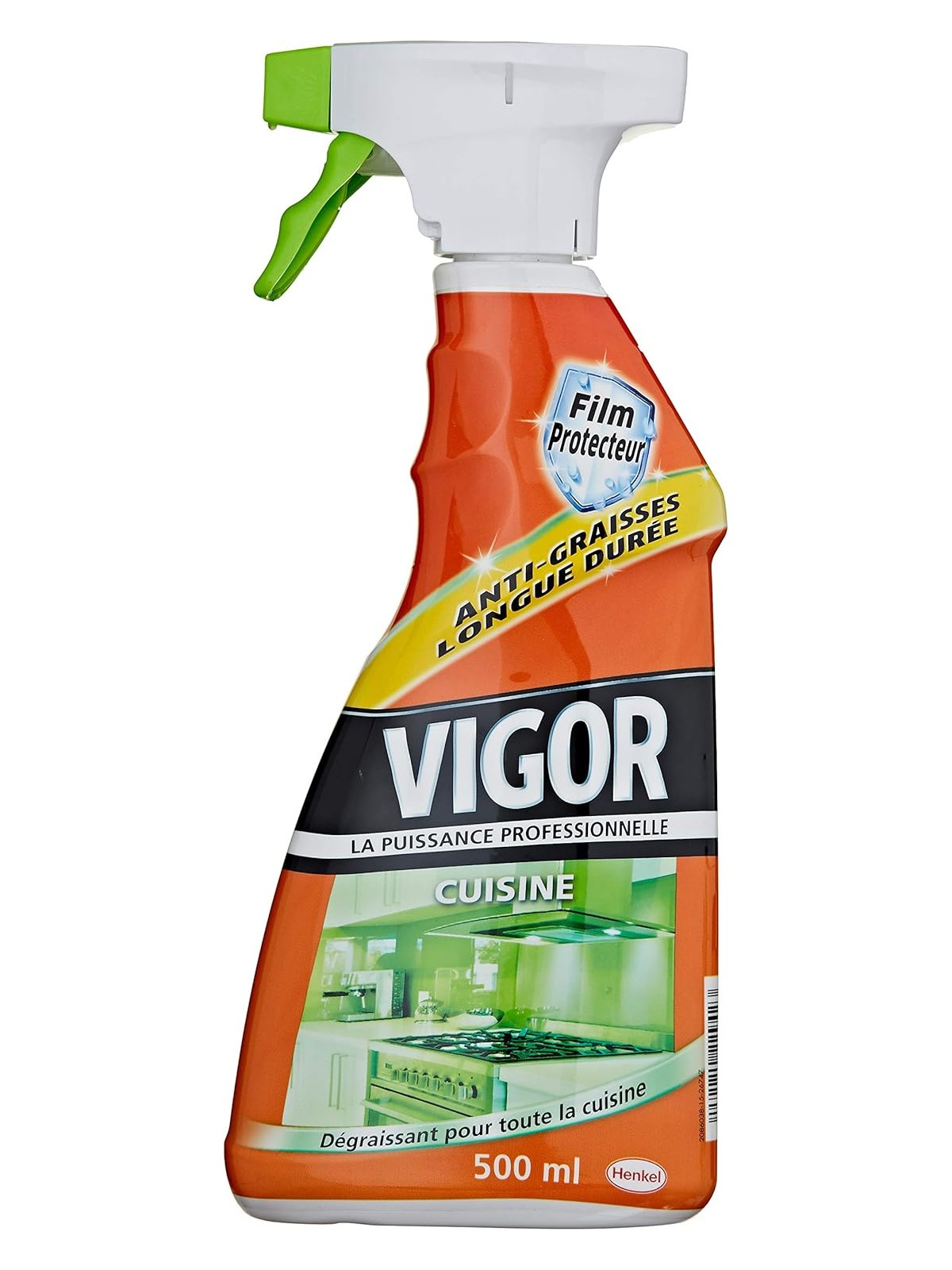 Vigo, la puissance professionnelle au service de l’entretien de votre maison. Vigo vous propose une large gamme de produits pour nettoyer à fond toute votre maison : des liquides multi-usagers et des sprays pour le nettoyage de votre cuisine et de votre salle de bain. Vigo une propreté parfaite tous les jours ! Le spray Vigo cuisine nettoie vos surface et réduit l’adhérence des graisses. Pour une propreté impeccable sans effort ! Mode d’utilisation : cuisinières, hottes de ventilation, grils, éviers en inox, fours, cheminées, appareils de cuisine, sols de cuisine, taches de graisse sur les vêtements et autres textiles lavables. Ne pas utiliser sur : surfaces en bois huilé ou ciré (le chêne, en particulier), surfaces peintes ou vernies, aluminium, linoléum, lunettes / casques.