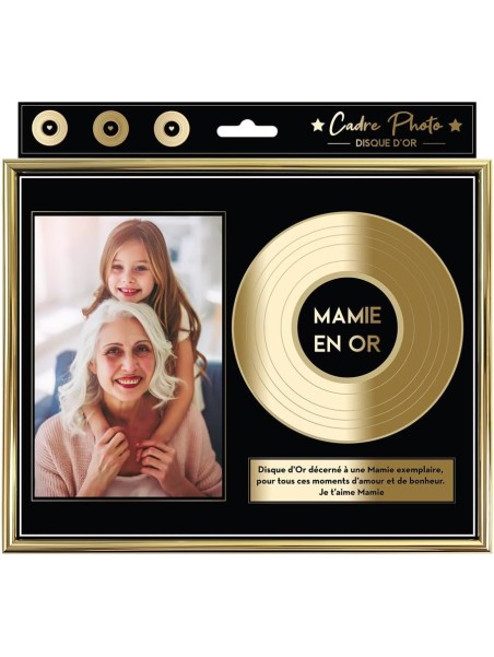 Vous cherchez un cadeau original pour votre mamie ? Optez pour ce Cadre photo disque d'or mamie ! Ce cadre photo est un accessoire de déco idéal pour faire plaisir à votre mamie. Et notamment lors de la fête des grands-mères. Le produit présente un encadré où vous pourrez glisser la photo de votre choix, un disque d'or "mamie en or" ainsi qu'un texte en l'honneur de votre mamie. Idéal pour lui montrer tout l'amour que vous lui portez !