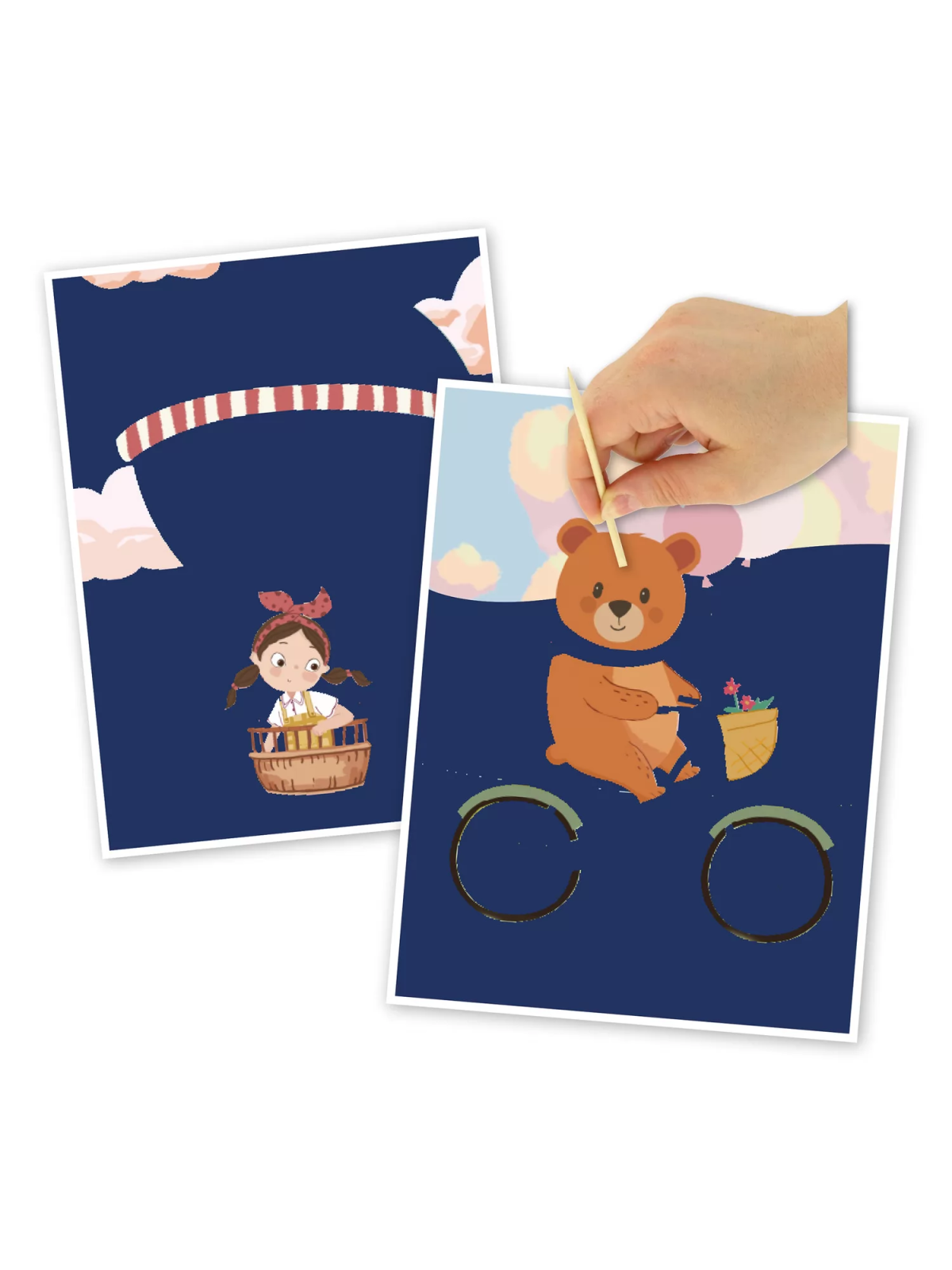 Offrez à vos enfants un voyage poétique et coloré avec ce kit de 2 cartes à gratter mettant en scène une petite fille et son ourson. Ils adoreront révéler les illustrations cachées en grattant la surface noire, donnant vie à un univers doux et enchanteur.
