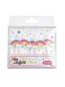 - Design adorable et coloré : Chaque bougie représente un charmant arc-en-ciel reposant sur de petits nuages blancs, apportant une touche de douceur et de fantaisie à votre gâteau.
