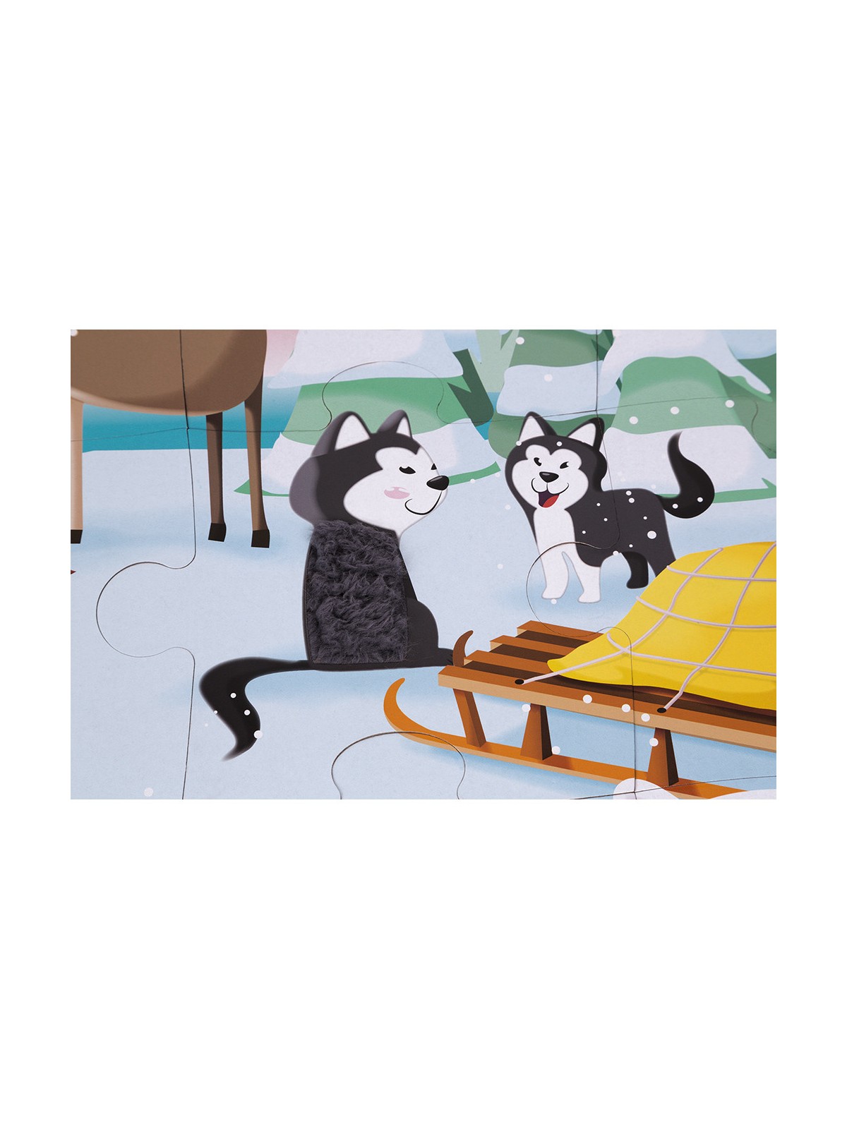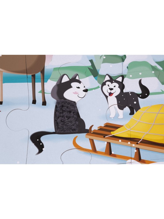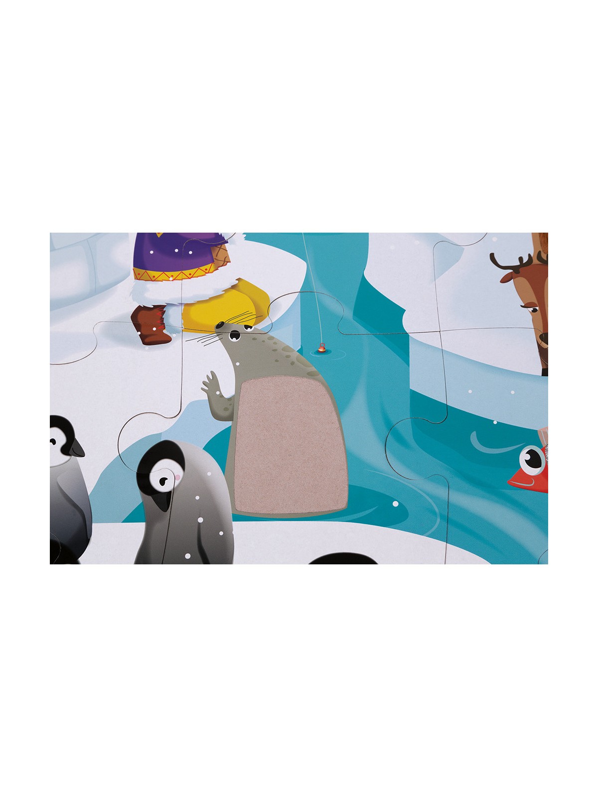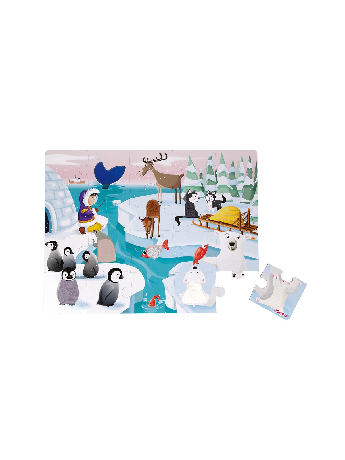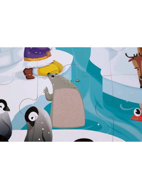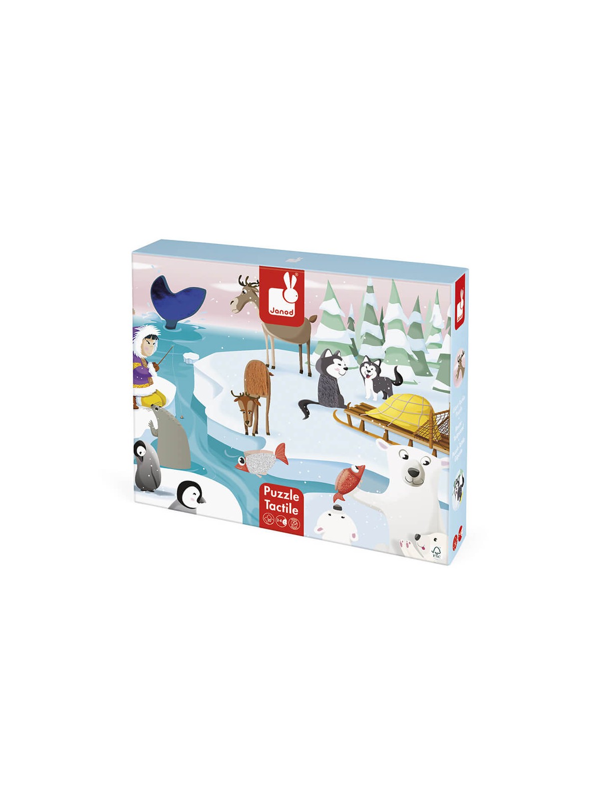 Les enfants vont adorer ce puzzle tactile géant sur le thème des animaux de la banquise. Ils feront travailler leur sens en touchant et en découvrant les matières et couleurs placées sur les animaux : pelage pour l’ours blanc, le manchot, effet paillettes pour le poisson, … Contient un poster servant de modèle. Puzzle : 65 x 50 cm. Nombre de pièces : 20, 7 pièces texturées. Ce produit est composé de matériaux certifiés FSC® et de matériaux contrôlés.