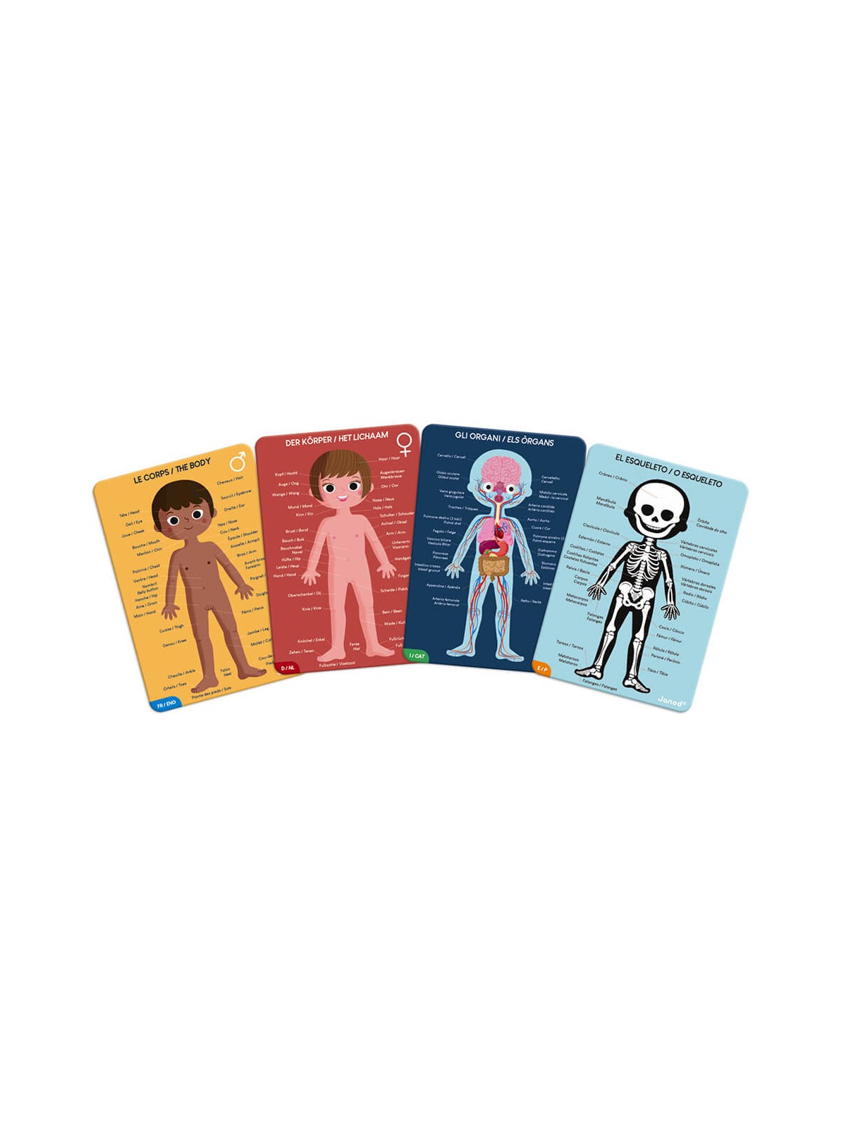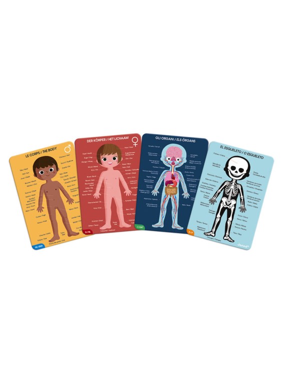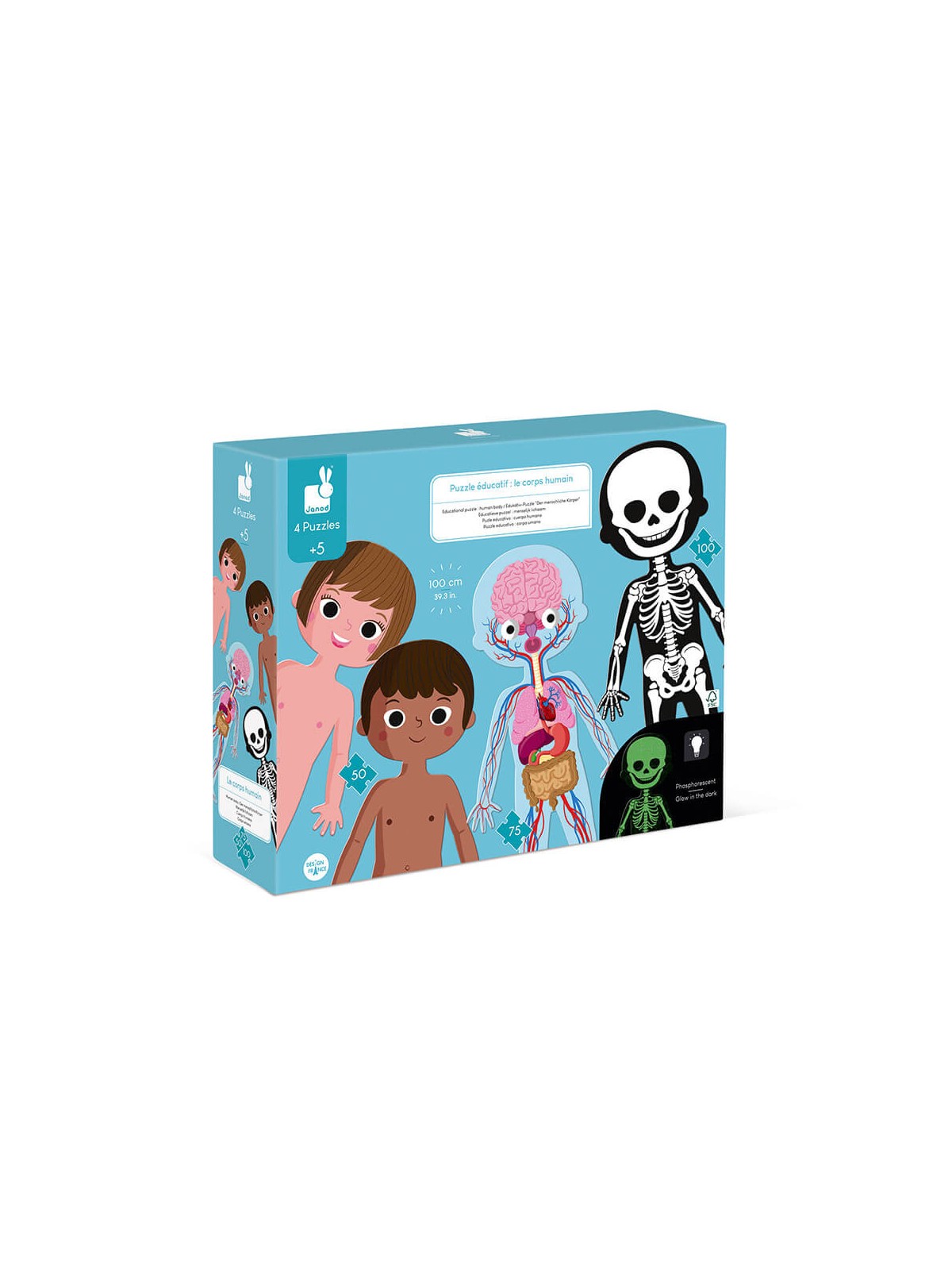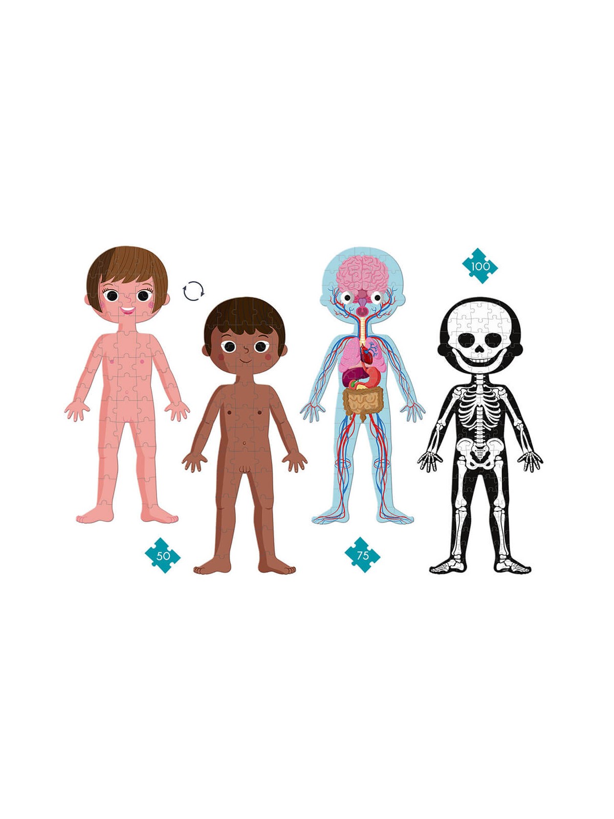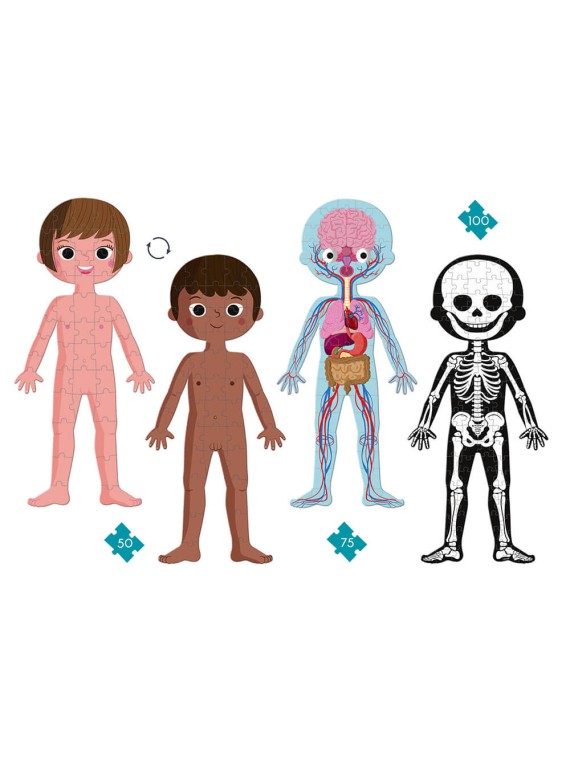 Votre enfant se pose beaucoup de questions sur le corps humain, comment fait-on pour respirer ou pour bouger nos doigts ? Ce coffret de 4 puzzles éducatifs géants va lui permettre de répondre à ses questions tout en s'amusant. Dès 5 ans, les enfants vont pouvoir découvrir les différences physiques entre les filles et les garçons et comprendre le fonctionnement de leur propre corps. Le coffret est composé d'1 puzzle recto/verso de 50 pièces fille/garçon, d'1 puzzle de 75 pièces des organes du corps humain et d'1 puzzle de 100 pièces phosphorescent sur le squelette. Chaque puzzle mesure 1 mètre de haut et est accompagné de cartes éducatives détaillées pour faciliter la compréhension des enfants et connaître les différentes parties du corps humain. Les cartes incluses sont disponibles en 12 langues: Français, Anglais, Allemand, Néerlandais, Polonais, Russe, Espagnol, Portugais, Catalan, Basque, Slovaque, Tchèque.