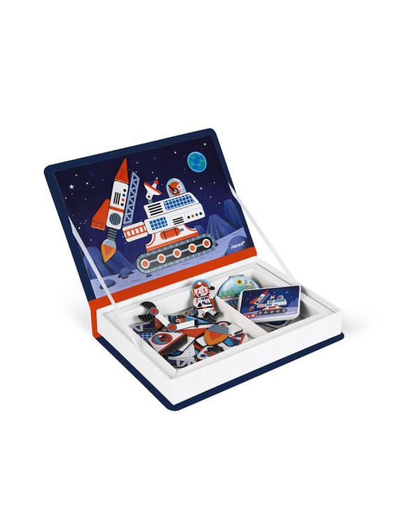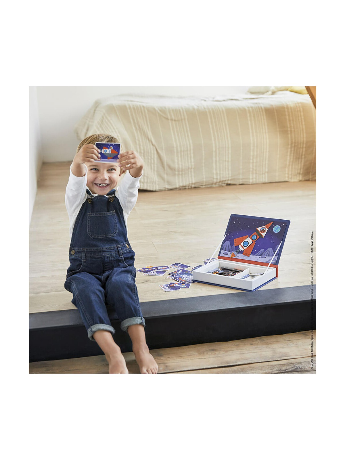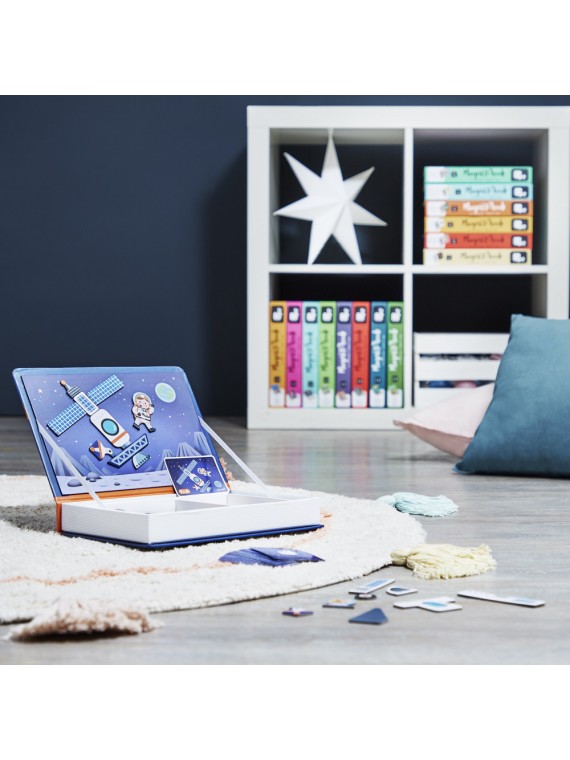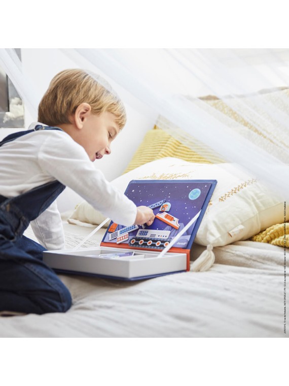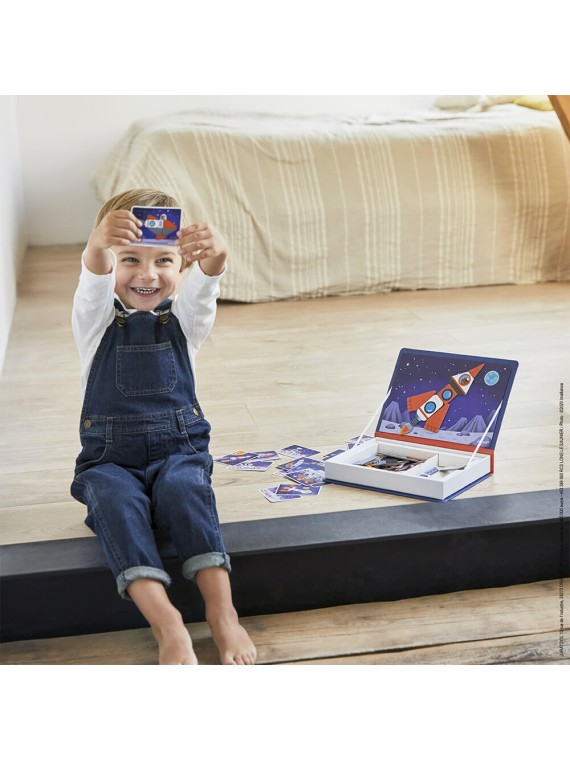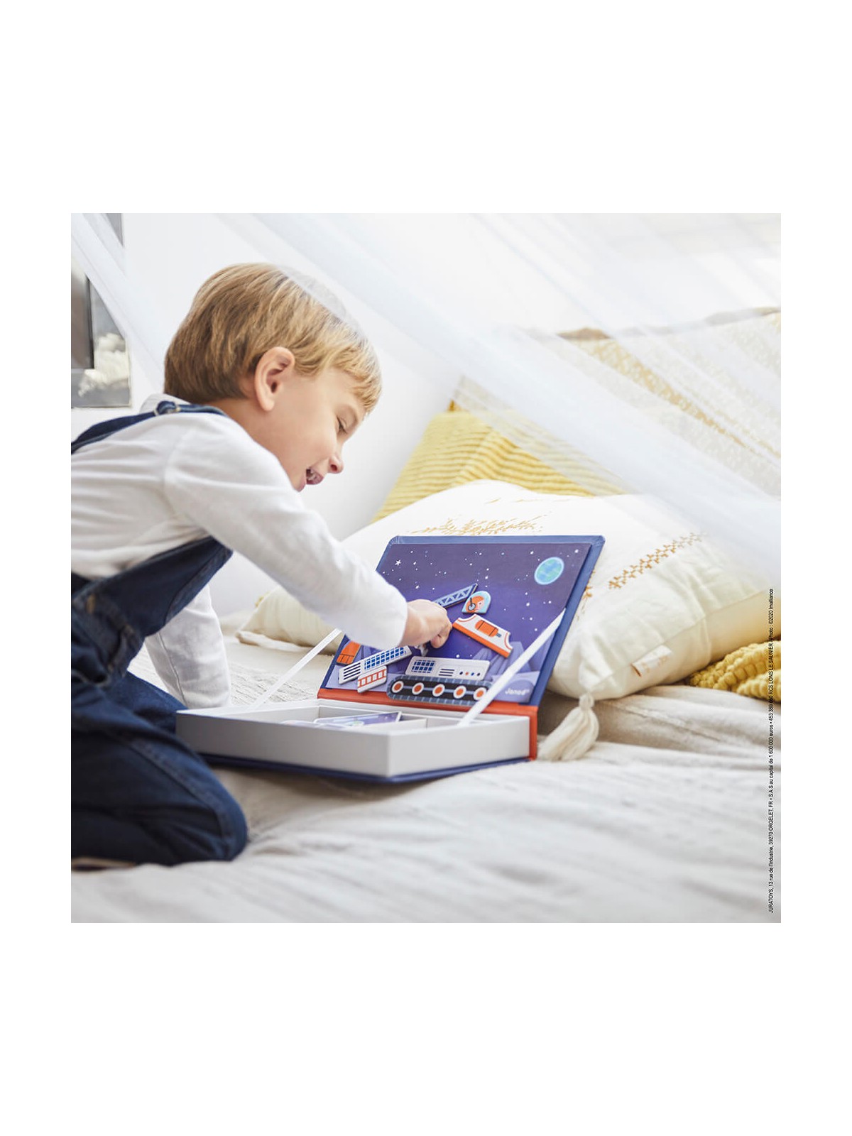 Connaissez-vous les Magnéti'book ? Ces livres magnétiques nomades et éducatifs sont adorés par les petits et les grands ! Le principe ? Un coffret magnétique renferme de nombreux éléments aimantés à associer en suivant les modèles ou en laissant parler sa créativité ! Ce jeu en carton transportera les petits à partir de 3 ans dans l'univers fascinant de l'espace et des planètes grâce à 52 magnets et 18 cartes. A l'intérieur, une scène magnétique permet de recomposer le véhicule spatial indiqué sur la carte à l'aide des magnets. L'enfant pourra également s'amuser à mélanger les différentes pièces entre elles pour créer des scènes rigolotes puisqu'elles sont toutes interchangeables ! Permet à l'enfant d'améliorer son imagination et sa motricité fine. Ce produit est composé de matériaux certifiés FSC® et de matériaux contrôlés.