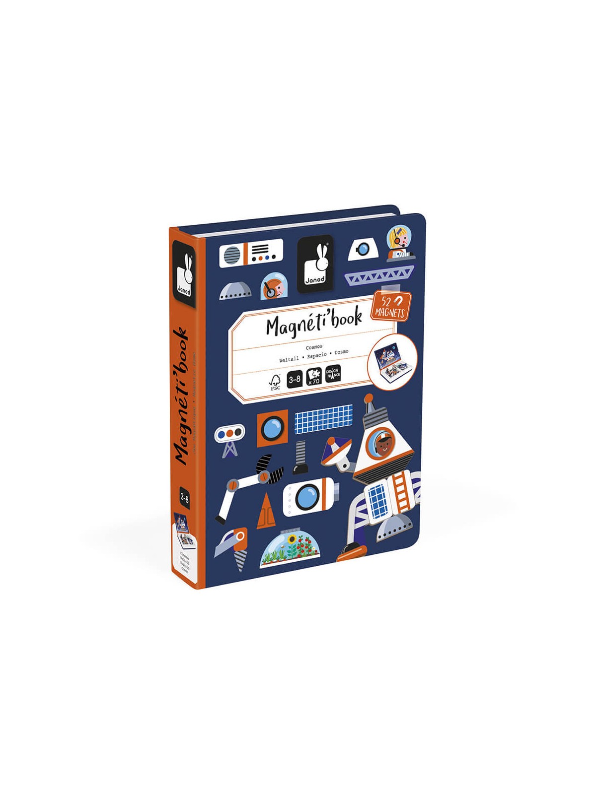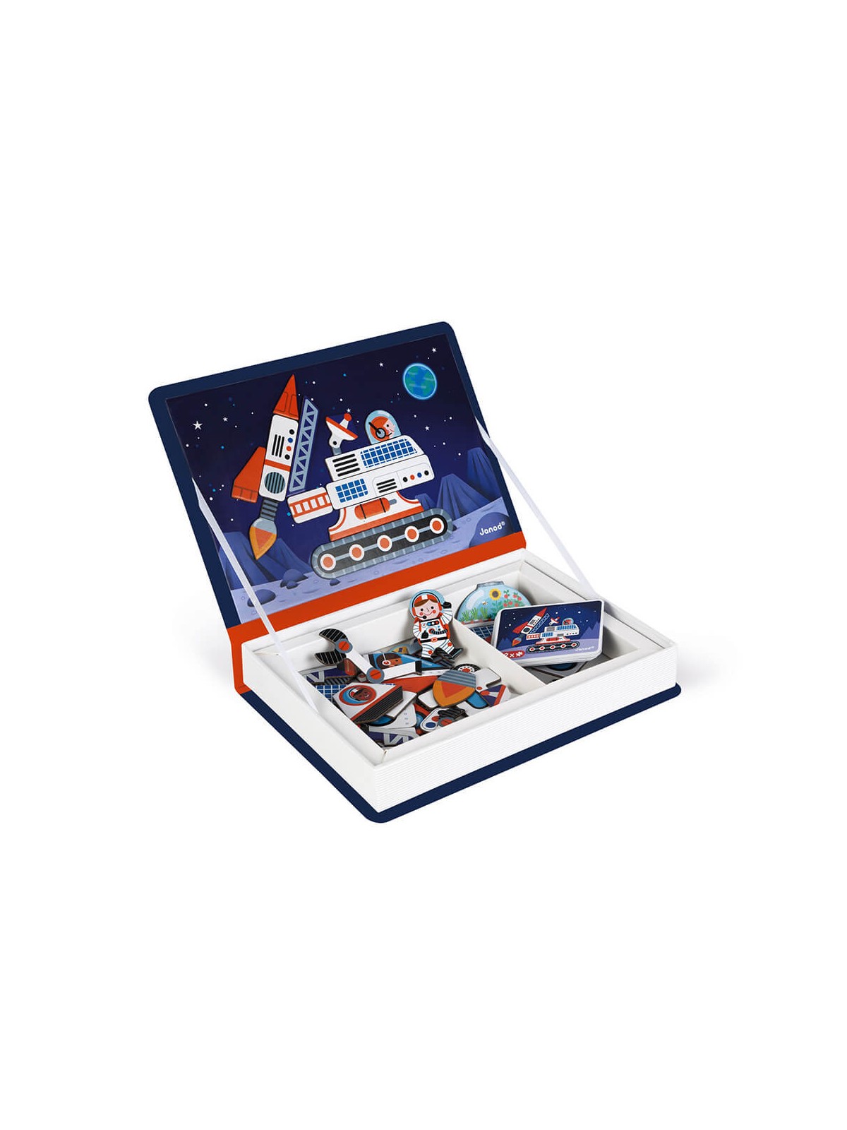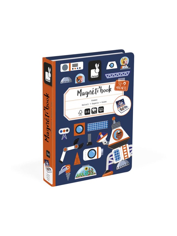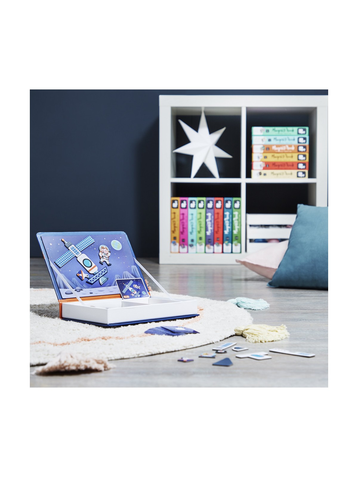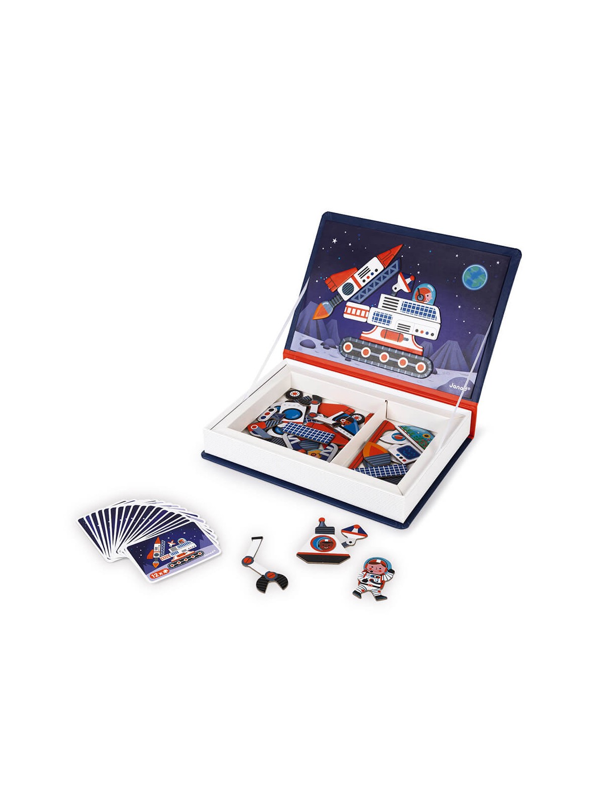 Connaissez-vous les Magnéti'book ? Ces livres magnétiques nomades et éducatifs sont adorés par les petits et les grands ! Le principe ? Un coffret magnétique renferme de nombreux éléments aimantés à associer en suivant les modèles ou en laissant parler sa créativité ! Ce jeu en carton transportera les petits à partir de 3 ans dans l'univers fascinant de l'espace et des planètes grâce à 52 magnets et 18 cartes. A l'intérieur, une scène magnétique permet de recomposer le véhicule spatial indiqué sur la carte à l'aide des magnets. L'enfant pourra également s'amuser à mélanger les différentes pièces entre elles pour créer des scènes rigolotes puisqu'elles sont toutes interchangeables ! Permet à l'enfant d'améliorer son imagination et sa motricité fine. Ce produit est composé de matériaux certifiés FSC® et de matériaux contrôlés.
