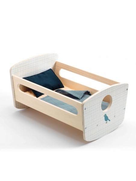 Un lit à bascule en bois naturel et aux couleurs tendres avec son matelas, son oreiller et sa couverture toute douce. Un véritable nid douillet pour sa poupée confortablement installée pour s’endormir paisiblement bercée par ses petits parents.